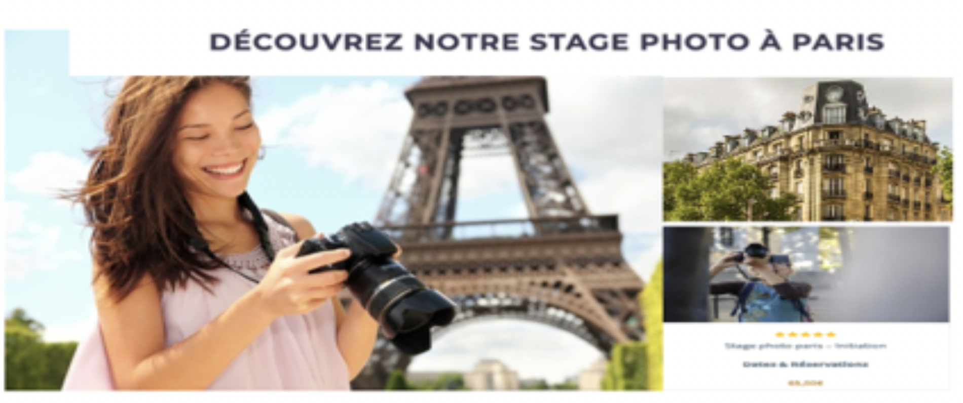 Le thème de cette image est organisation sociale. Cette image est une page d’un site web intitulé « Découvrez notre stage photo à Paris ».
