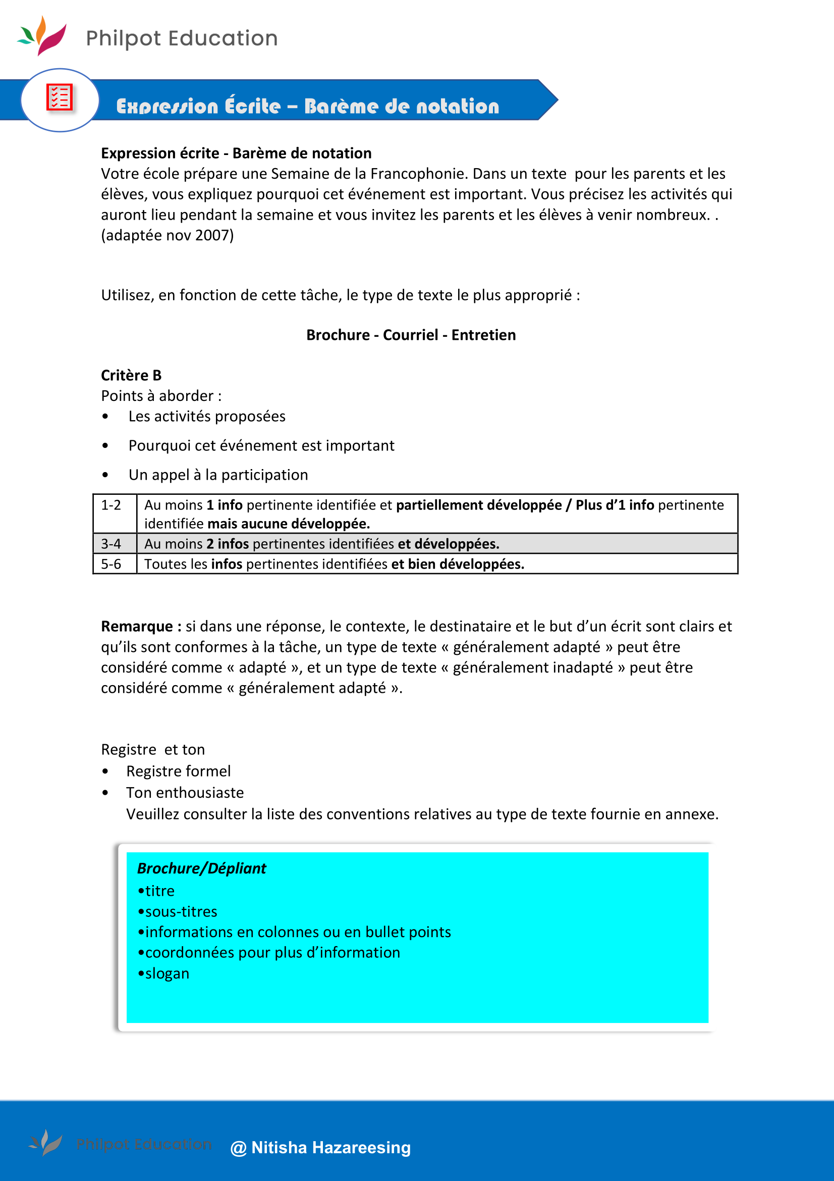 Une brochure(ou un dépliant) est un texte distribué à un public afin de faire la promotion d’un club ou d'une association, d’un établissement scolaire ou d'une région touristique, d’un produit ou d’un service. Écrire une brochure dans le cadre de la langue B donne l’opportunité de montrer de la créativité et de l'imagination du point de vue de la mise en page. Toutefois il faut que certains éléments soient présents.