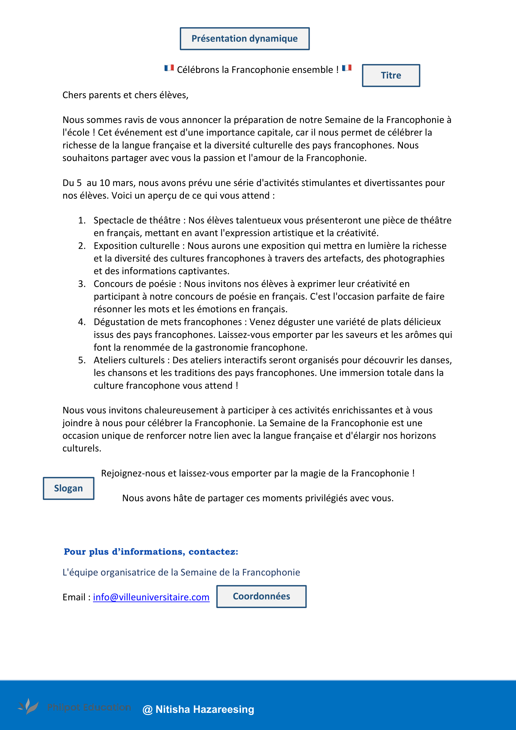Votre école prépare une Semaine de la Francophonie. Dans un texte pour les parents et les élèves, vous expliquez pourquoi cet événement est important. Vous précisez les activités qui auront lieu pendant la semaine et vous invitez les parents et les élèves à venir nombreux. . (adaptée nov 2007)