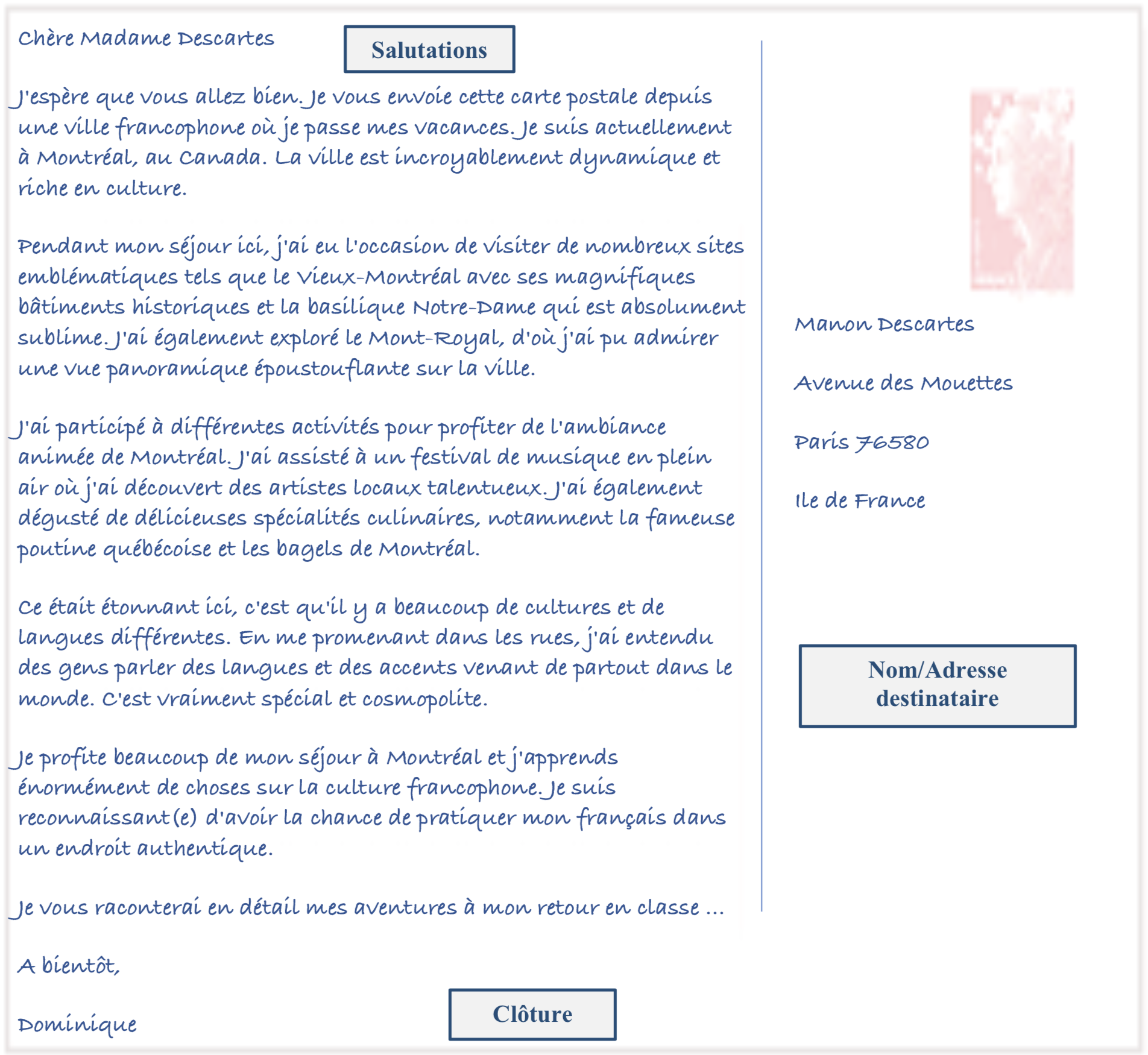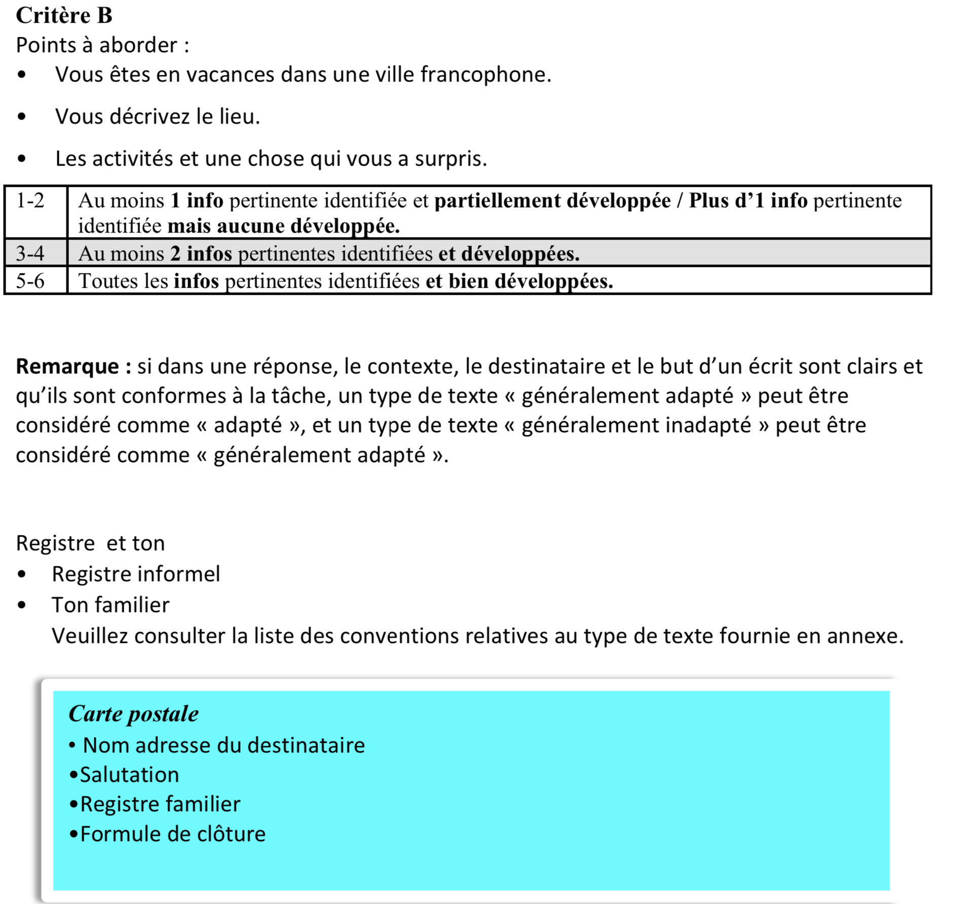 Vous êtes en vacances dans une ville francophone. Écrivez un texte à votre professeur de français et donnez des détails sur le lieu où vous passez vos vacances, les activités que vous avez faite et une chose qui vous a surpris(e). (Adapté Nov2012)