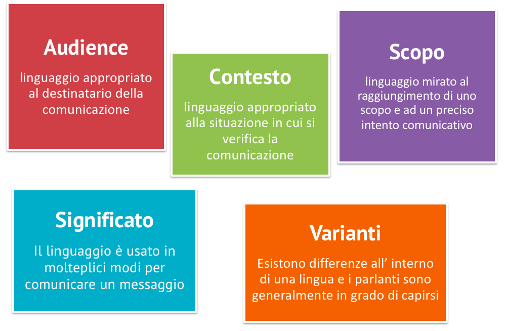 | Conceptual understanding | Gli studenti comprendono che il linguaggio dovrebbe essere appropriato per il raggiungimento di una precisa intenzione, obiettivo o risultato |