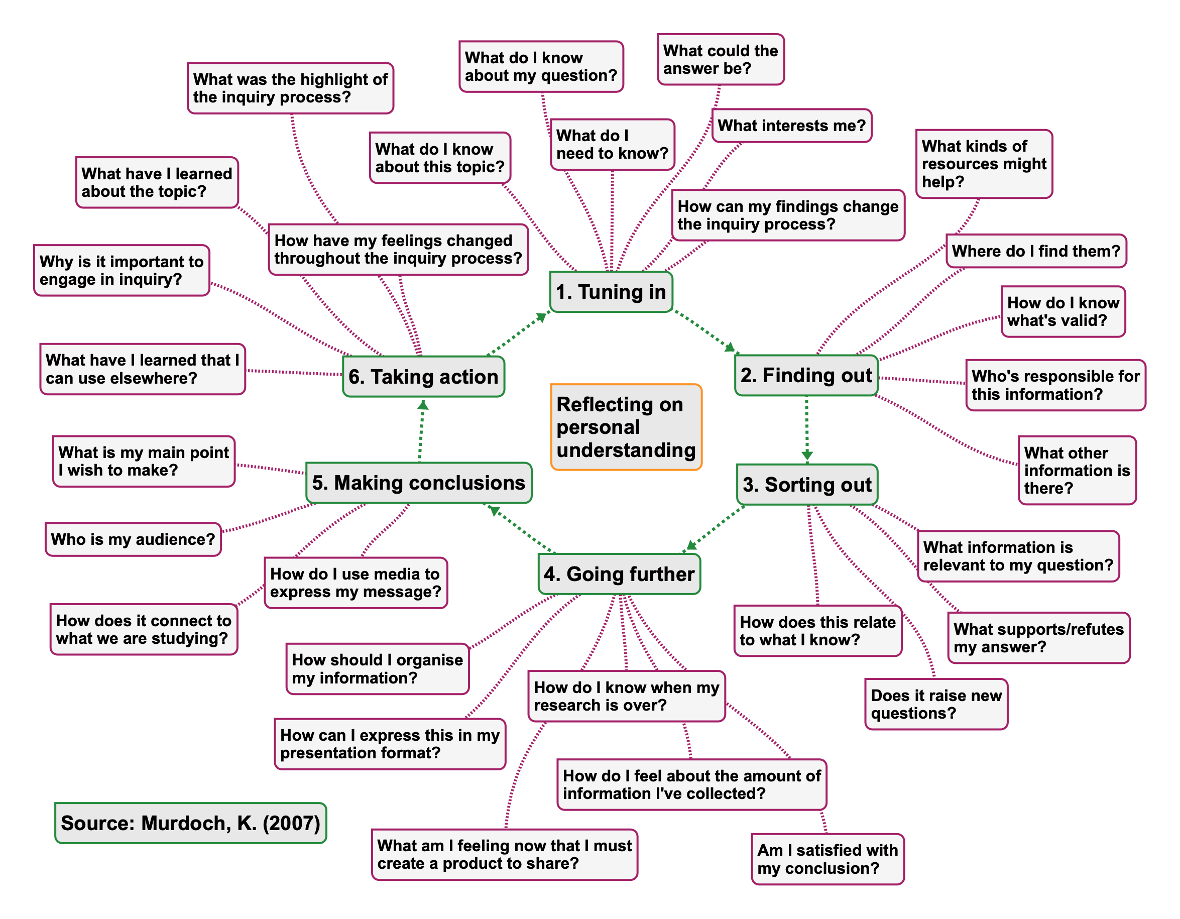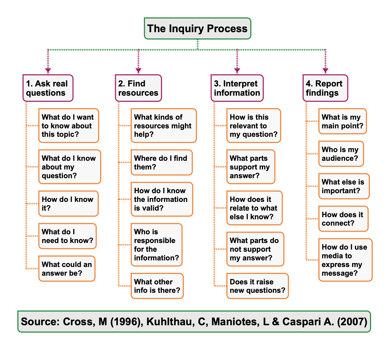 'Inquiry-based learning' is a method of learning, in which the student's curiosity is central to the learning process. Have you already asked yourself: 'What do I already know about my topic, subject and question?' or: 'What do I want to find out? The KWL diagram is a good starting point to a larger road map. If the Extended Essay is an exercise in inquiry, then it helps to know what inquiry looks like. Here is a snapshot: